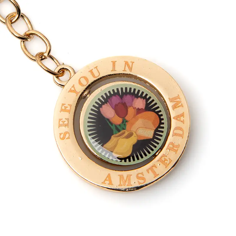 In het hart van deze draaiende sleutelhanger vind je een zwart bolletje, met daarop nauwkeurig weergegeven tulpen, klompen en een blok kaas – waarvan één stukje is afgesneden